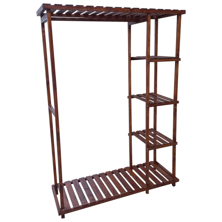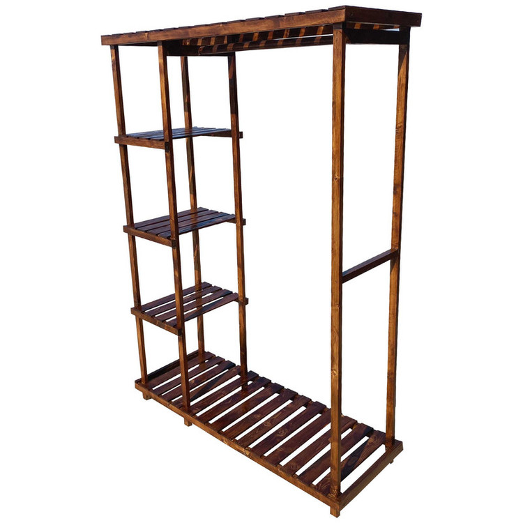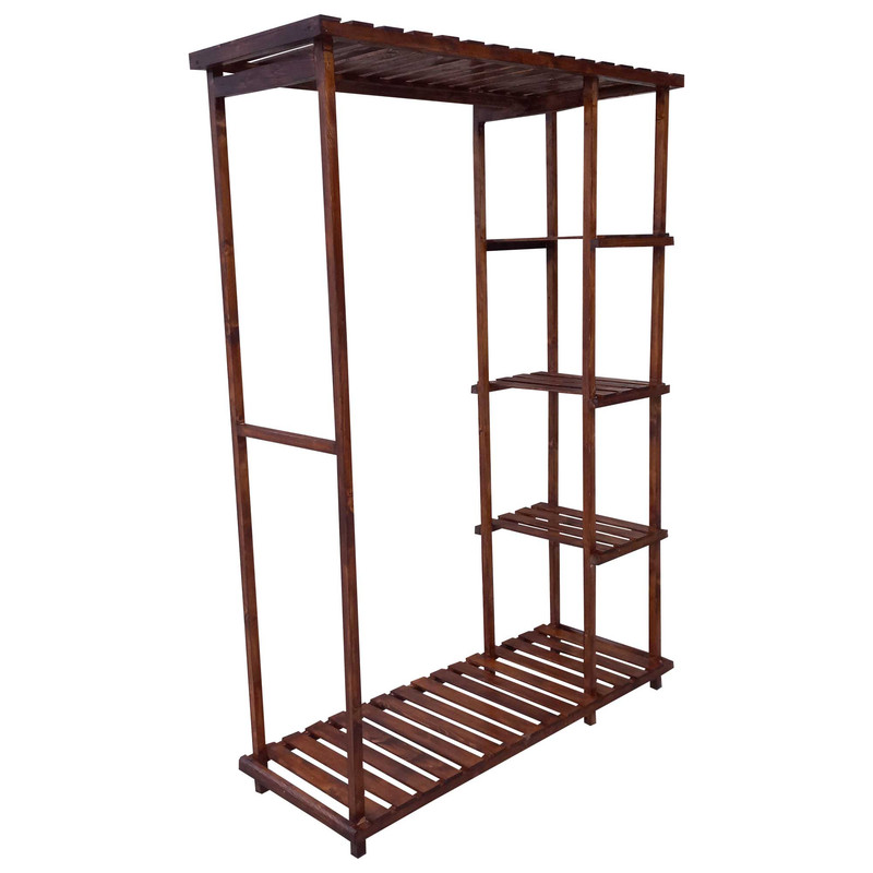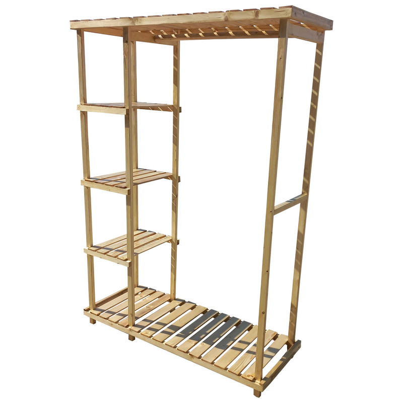 رگال لباس چوبی مدل مستطیلی طبقه دار دارای طبقات برای قرار دادن کیف و کفش و لباس میله اویز لباس چوبی به طول 85 سانتی متر و همچنین کفی و سقف برای قرار دادن سایر وسایل در رنگ بندی قهوه ایی کرم